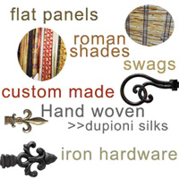 DRAPERIES Custom Made Drapes Sheers & Side Panels Upholstered Cornice Boxes Fabric Valances & Wood Cornices Roman Soft Fold Shades Wrought Iron & Wood Rods